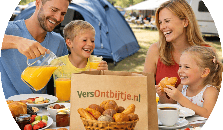Ontbijt zonder zorgen, tussen 08:00 en 10:30 uur direct bij uw tent of uw chalet bezorgd.